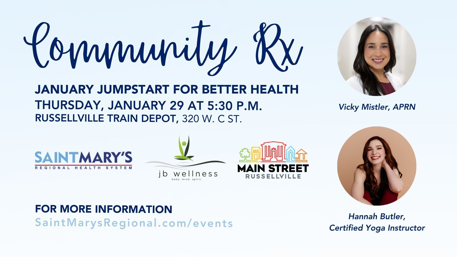 Saint Mary’s Regional Health System, in partnership with Main Street Russellville, invites the community to attend Community Rx: January Jumpstart for Better Health on Thursday, January 29, from 5:30 to 6:30 p.m. at the Russellville Train Depot located at 320 W. C St.